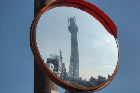 平日にもかかわらず多数の見学者の中を揉まれながら、建設現場を挟む北十間川ぞいの通路を歩きながら鑑賞する。高さ448mまで達した至近距離から見るタワーの大きさは絶大で圧倒された。