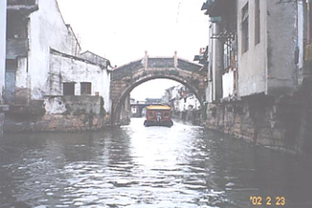 蘇州運河 蘇州は、東洋のベニスと言われている。15人位乗るモーター付き遊覧船で運河を遊覧。運河の両側は民家の裏口で、ゴミが多く、下水を流している所もあり、とても観光を楽しむ状況ではない。一昨年訪れたベニスは素晴らしい景観で、ゴンドラも手漕ぎ船でとても優雅で素晴らしかった。例えられたベニスが怒るだろう。