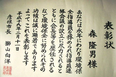 『森 隆男さん環境保全に貢献』として彦根市より賞を受けられました